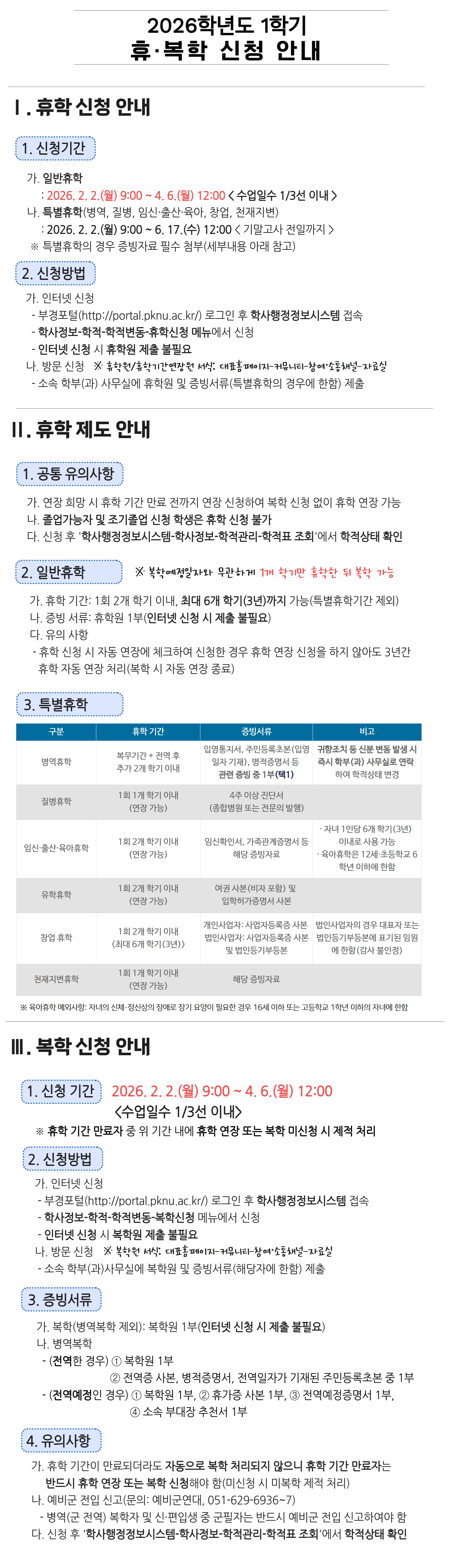 [학부/일대/산대] 2026학년도 1학기 휴·복학 안내